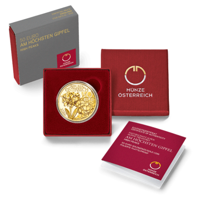 Die höchste Prägequalität Polierte Platte verleiht beiden Seiten der Goldmünze einen üppigen Glanz. Das Sammlerstück mit einem Feingewicht von 1/4 oz trägt den Nennwert von 50 Euro. Der Feingehalt liegt bei 986/1000. Die Goldmünze hat einen Durchmesser von 22 Millimetern und einen glatten Rand. Sie wird gekapselt und im Etui ausgegeben. Ein Echtheitszertifikat gehört dazu. Zu der Serie Naturschatz Alpen ist außerdem ein Sammleretui aus Holz erhältlich.