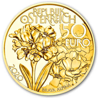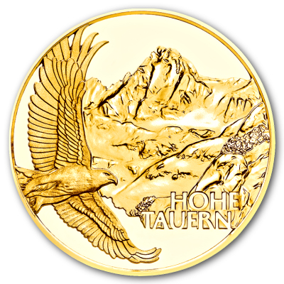 Schroffe Gipfel, weiß strahlende Gletscher und blaue Bergseen: Die grandiose Kulisse des Nationalparks Hohe Tauern haben die Designer der Goldmünze geschickt eingefangen. Im Vordergrund kreist ein Steinadler, einer der selten gewordenen Alpenbewohner, die in der Region ein Rückzugsgebiet gefunden haben. Kein Wunder: Mit einer Größe von 1.856 Quadratkilometern ist der Nationalpark das größte Naturschutzgebiet in den Alpen. Nicht nur die Tier- sondern auch die Pflanzenwelt profitiert davon. Dafür steht das Alpenbreitschötchen auf der Wertseite. Diese Pflanze kommt nur in den Ostalpen vor, zum Beispiel am Großglockner. Ihr wissenschaftlicher Name Braya Alpina ist unten verzeichnet.