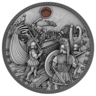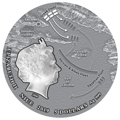 Die Silbermünze zeigt, wie die Griechen mit ihren von Ruderern angetriebenen Trieren die Schiffe der Perser versenken. Oben ist eine kleine Scheibe aus dem exotischen Lapacho-Holz in das Motiv eingelegt, die einen Delfin zeigt. Diese Tiere waren bei den Griechen heilig. Ein Rahmen mit einem griechischen Muster rundet das Bild ab. Der Münzrand ist glatt. Umseitig kann man sich die Truppenbewegungen während des Perserkriegs ansehen. Da das Sammlerstück von Niue ausgegeben wird, ist auch ein Porträt von Queen Elizabeth II. abgebildet. Der Nennwert beträgt 5 Dollars. Die Silbermünze hat einen Durchmesser von 45 Millimetern und enthält 2 oz Feinsilber (Feingehalt 999/1000). Sie wird in einem Etui mit schön gestalteter Umverpackung ausgegeben. Ein Echtheitszertifikat gehört dazu.