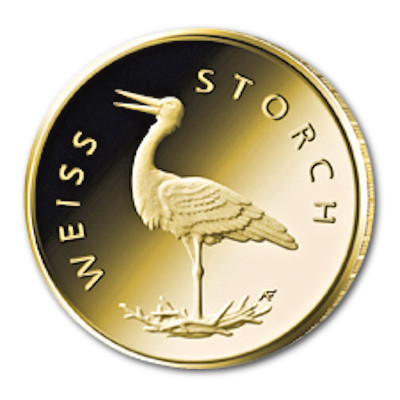 An seinen langen Beinen und dem großen Schnabel ist Meister Adebar gleich zu erkennen: Die Ausgabe 2020 der 20-Euro-Goldmünzen-Serie „Heimische Vögel“ zeigt den Weißstorch. Er folgt auf Wanderfalke, Uhu, Nachtigall und Pirol. Die goldenen Anlagemünzen aus 1/8 oz Feingold sind in Stempelglanz-Qualität geprägt und haben eine limitierte Auflage von 175.000 Exemplaren.