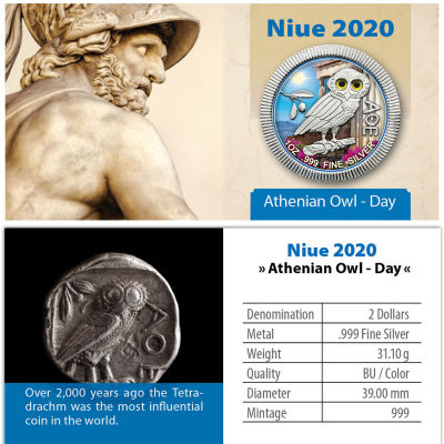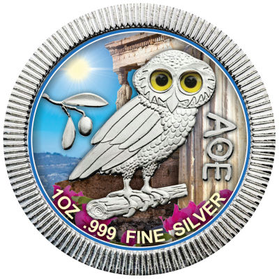 Die Eule ist das Symbol der Göttin Athene – und da diese auch die Schutzgöttin Athens war, waren dort in der Antike natürlich besonders viele Eulen zu finden. Auf den Tetradrachmen war die Eule neben einem Olivenzweig abgebildet. Auch die Buchstaben an der Seite stammen von dem historischen Original und bedeuten so viel wie „von Athenern“. Unten findet man randläufig die Angaben zum Gewicht von 1 oz Feinsilber und dem Feingehalt von 999/1000. Auf der kolorierten Version ist im Hintergrund die Akropolis zu sehen: Helle Säulen heben sich vom strahlend blauen Sommerhimmel ab.