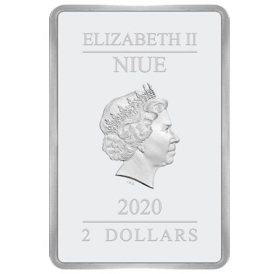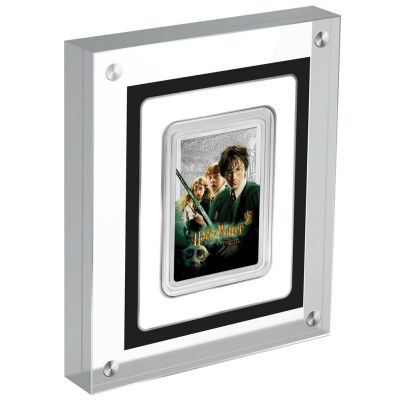 Die detailreiche Prägung im Hintergrund hebt die farbigen Figuren zusätzlich hervor. Ergänzt wird das Motiv vom Logo des Films und dem Gryffindor-Wappen. Die Silbermünze ist in höchster Proof-Qualität geprägt. Sie misst 36 mal 53 Millimeter und enthält 1 oz Feinsilber (Feingehalt 999/1000). Der Münzrand ist geriffelt. Die Wertseite zeigt das Rank-Broadley-Porträt von Königin Elizabeth II. und den Nennwert von 2 Dollars. Niue ist das Ausgabeland. Verpackt ist das Sammlerstück in ein Präsentationsetui aus Plexiglas und einen Shipper mit Harry-Potter-Bild. Ein nummeriertes Echtheitszertifikat gibt es dazu.