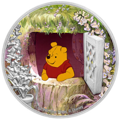 Die Silbermünze präsentiert mit ihrer Kombination aus Prägung und Kolorierung ein liebevoll gestaltetes Motiv. Der Bär steht am Fenster seines Hauses und blickt nach draußen zum Betrachter. Üppige Blüten umrahmen das Fensterchen. Unten am Rand findet man nicht nur die Angaben zum Gewicht von 1 oz und dem Feingehalt von 999/1000, sondern auch das Copyright-Zeichen, das die Silbermünze als lizenziertes Disney-Produkt ausweist. Das Sammlerstück ist in höchster Proof-Qualität und hat einen Durchmesser von 40 Millimetern. Der Münzrand ist geriffelt. Die Wertseite zeigt das Porträt von Königin Elizabeth II. und den Nennwert von 2 Dollars. Niue ist das Ausgabeland. Die Silbermünze wird in einem Präsentationsetui und einem Karton ausgegeben. Letzterer zeigt Winnie Puuh mit seinen Freunden Ferkel, I-Aah & Co. Außerdem gehört ein nummeriertes Echtheitszertifikat dazu.