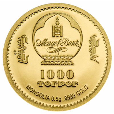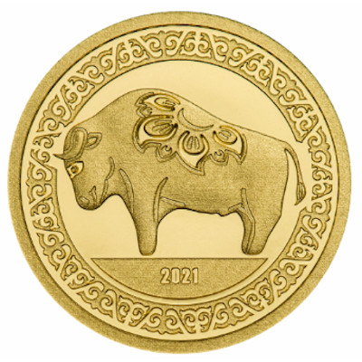 Ruhig und geduldig wirkt der Ochse auf dem Motiv der Goldmünze. Er ist seitlich dargestellt. Ein Blumenornament schmückt seinen breiten Rücken. Unten findet man die Jahreszahl 2021. Das Sammlerstück hat einen Durchmesser von 11 Millimetern und enthält 0,5 g Feingold. Der Feingehalt liegt bei 99,99 Prozent. Das in höchster Qualität Polierte Platte geprägte Goldstück wird von der Bank of Mongolia verausgabt. Der Nennwert ist 1.000 Tögrög angegeben. Die Goldmünze hat einen geriffelten Rand und wird gekapselt ausgegeben.
