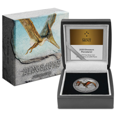 dinosaurier-pterodactylus-1-oz-silber-koloriertVor Millionen von Jahren beherrschten die Dinosaurier nicht nur die Erde, sondern auch die Luft. Die dritte Ausgabe der Dino-Silbermünzen-Serie der New Zealand Mint nach Tyrannosaurus rex und Triceratops ist deshalb dem Pterodaktylus gewidmet. Der Flugsaurier wird mit Antik-Finish und Farbapplikationen zum Blickfang. Die Auflage ist streng limitiert auf nur 2.000 Exemplare.