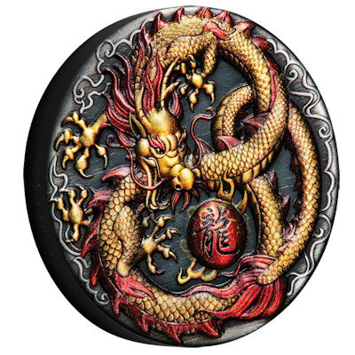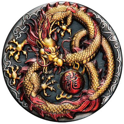 dragon-2020-2-oz-silber-koloriertChinesische Drachen haben einen schlangenartigen Leib, deswegen kann sich dieses Fabelwesen auch in die Form der chinesischen Glückszahl Acht winden. Ein weiteres traditionelles Symbol ist die Flammenperle, die für Weisheit und Aufklärung steht. Wie die Mähne des Drachen ist sie rot koloriert, während der schuppige Körper des mythischen Wesens in Gold gehalten ist. Die Farben heben sich leuchtend vom Hintergrund ab, der durch das Antik-Finish eine Patina wie ein historisches Artefakt bekommt.