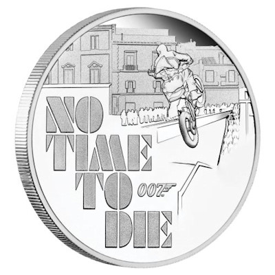 Das Motiv der Silbermünze zeigt neben dem Motorrad im Sprung das Logo des Films sowie das berühmte 007-Logo mit der Pistole. Das Sammlerstück ist in höchster Proof-Qualität geprägt und enthält 1 oz Feinsilber bei einem Feingehalt von 99,99 Prozent. Der Durchmesser liegt bei 40,9 Millimetern. Der Münzrand ist geriffelt. Die Wertseite zeigt das Porträt von Königin Elizabeth II. und den Nennwert von 1 Dollar. Ausgabeland ist Tuvalu. Die James-Bond-Silbermünze ist in ein schwarzes Etui verpackt und wird zusammen mit einem nummerierten Echtheitszertifikat ausgegeben.