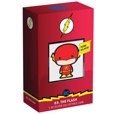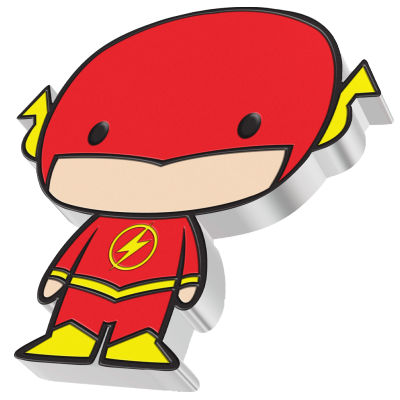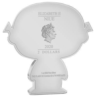 Der Chibi-Flash trägt den klassischen gelb-roten Superheldenanzug. Er enthält 1 oz Feinsilber (Feingehalt: 999/1000) und ist 31,5 mal 36,0 Millimeter groß. Während die Motivseite komplett koloriert ist, ist die Wertseite silbern: Hier findet man das Porträt der Königin Elizabeth II. von Ian Rank-Broadley, den Nennwert von 2 Dollars und das Ausgabeland Niue. Verpackt ist die Silbermünze in ein Etui, in dem sie sich gut geschützt präsentieren lässt. Ein nummeriertes Echtheitszertifikat gehört dazu.