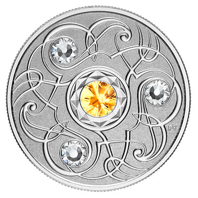 Bei dem „Topas“ auf der Silbermünze handelt es sich natürlich um einen gelben Swarovski-Kristall – sonst könnte das Sammlerstück nicht so günstig verkauft werden. Er ist umgeben von drei kleineren weißen Kristallen und in ein keltisches Muster eingebettet. Die Silbermünze enthält 1/4 oz Feinsilber (Feingehalt 99,99 Prozent) und hat einen Durchmesser von 27 Millimetern. Die Wertseite zeigt das Susanna-Blunt-Porträt von Königin Elizabeth II. Der Nennwert ist mit 5 CAD angegeben. Der Münzrand ist geriffelt. Das Sammlerstück wird mit nummeriertem Echtheitszertifikat, gekapselt und im Etui ausgegeben.