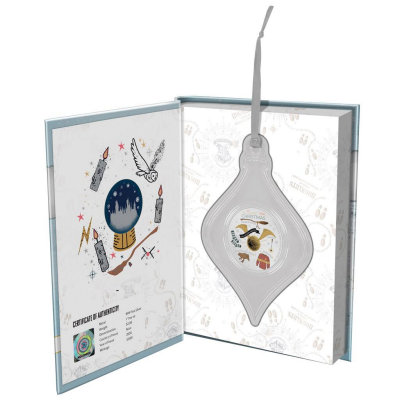 harry-potter-christmas-2020-1-oz-silber-koloriert-wertseiteDas in höchster Proof-Qualität geprägte Sammlerstück enthält 1 oz Feinsilber und hat einen Feingehalt von 999/1000. Der Durchmesser liegt bei 40 Millimetern. Der Münzrand ist geriffelt. Wie bei den anderen Harry-Potter-Silbermünzen der Prägeanstalt fungiert Niue als Ausgabeland. Die Wertseite zeigt das Porträt von Königin Elizabeth II. Der Nennwert liegt bei zwei Dollars. Verpackt ist die Silbermünze in ein buchartiges Etui mit Harrys Schneeeule Hedwig auf dem Titel. Es enthält auch das nummerierte Echtheitszertifikat. Ein echter Clou ist die Münzkapsel: Sie hat die Form von Christbaumschmuck und kommt komplett mit Anhänger. Wie die sternförmige Weihnachtsmünze der Perth Mint eignet sich dieses Sammlerstück also auch perfekt als Deko.