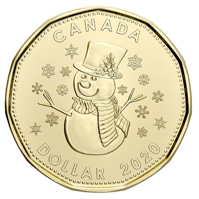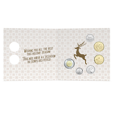Ein besonderer Blickfang ist die weihnachtliche Dollarmünze. Sie zeigt einen Schneemann, der von liebevoll gestalteten Schneeflocken umgeben ist. Er trägt einen Schal und einen mit Stechpalme dekorierten Zylinder. Das Set enthält außerdem einen kompletten Kursmünzensatz: die 2-Dollar-Münze mit dem Eisbären, die Dollarmünze mit dem Eistaucher, die 25-Cent-Münze mit dem Karibu, die 10-Cent-Münze mit der Bluenose und die 5-Cent-Münze mit dem Biber. Mit Ausnahme der Dollarmünzen und des inneren Rings der 2-Dollar-Münze, die dank Messingüberzug golden glänzen, bestehen die Münzen aus vernickeltem Stahl. Der Gesamtwert beläuft sich auf 4,40 Dollar.