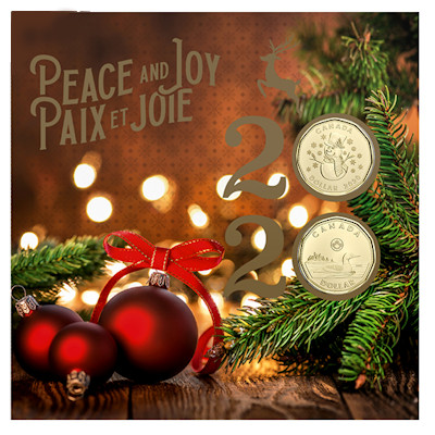 Peace and Joy beziehungsweise Paix et Joie wünscht die Royal Canadian Mint den Münzsammlern jedes Jahr mit ihrem Weihnachtskursmünzensatz in Blister-Verpackung. Wer möchte, gibt diese Grüße an einen Numismatik-Fan weiter. Das Set ist Grußkarte und Geschenk in einem. Außen zeigt es dieses Jahr Tannenzweige und rote Christbaumkugeln. Die Nullen der Jahreszahl 2020 lassen jeweils eine der sechs enthaltenen Münzen durchblicken. Innen ist die Karte mit den Worten „Wishing you all the best this holiday season!“ bedruckt. Rund herum ist noch Platz, um etwas dazu zu schreiben.
