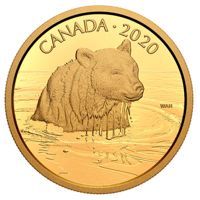 Grizzlys stehen gerade im Fokus – dank der preisgekrönten Filmdokumentation „Der Bär in mir“, die im Oktober in den Kinos startete. Der Film wurde zwar in Alaska gedreht, doch auch Kanada ist Bärenland. Ungefähr 25.000 der großen Braunbären sollen in der kanadischen Wildnis leben. Dort sind sie als die größten Raubtiere vielerorts die unangefochtenen Herrscher der Wildnis – nur der im Norden lebende Eisbär ist noch größer und gefährlicher. Trotz aller Dominanz hat aber auch ein ausgewachsener Grizzly seine entspannten Momente – wie der Bär auf dem Motiv der Goldmünze: Er taucht gerade aus einem Fluss auf, Wasser tropft von seiner Nase und aus seinem Fell. Vielleicht war er auf der Jagd nach Lachsen, vielleicht wollte er sich aber auch einfach nur an einem warmen Sommertag ein bisschen erfrischen.