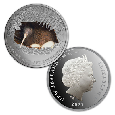 Unten ist der Name der Kiwi-Art verzeichnet, rechts der Nennwert von 1 Neuseeland-Dollar. Die Silbermünze hat einen Durchmesser von 40 Millimetern und entält 1 oz Feinsilber bei einem Feingehalt von 999/1000. Der Münzrand ist geriffelt. Umseitig ist das Ian-Rank-Broadley-Porträt von Königin Elizabeth II. aufgeprägt. Auf dieser Seite findet man auch die Jahreszahl 2021. Das Sammlerstück wird im Etui und inklusive eines nummerierten Echtheitszertifikats ausgeliefert.