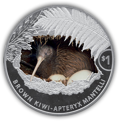 Der Nördliche Streifenkiwi (Apteryx mantelli), auch Brauner Kiwi genannt, lebt, wie der Name schon vermuten lässt, auf der Nordinsel Neuseelands und ist wie alle Kiwis flugunfähig. Im Schutz der Nacht sucht er mit seinem langen Schnabel nach kleinen Lebewesen im Boden, von denen er sich ernährt. Die Eier werden hauptsächlich von den Männchen ausgebrütet, was mehr als 80 Tage dauern kann. Dafür verlassen die Jungen das Nest schon etwa eine Woche, nachdem sie geschlüpft sind. Passend zu seiner Lebensweise im Verborgenen ist der Kiwi auf dem Motiv der Silbermünze nur im Schutz der Vegetation zu sehen. Die detailreich gravierten Pflanzen lassen ein Fenster frei, in dem der kolorierte Kiwi mit den beiden Eiern abgebildet ist.