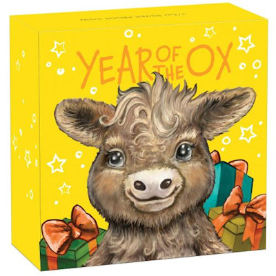 Mit der Ausgabe Baby Mouse startete vergangenes Jahr ein neuer Lunar-Zyklus. Dem Konzept dieser besonderen Serie bleibt die Perth Mint aber treu: Auch die neueste Edition zeigt wieder ein niedliches Tierkindermotiv, das mit lebhaften Farbapplikationen gestaltet ist. Der kleine Büffel mit dem lockigen Fell sitzt hinter einem grünen Päckchen und blickt aus großen, glänzenden Augen zum Betrachter auf. Das passende chinesische Schriftzeichen ist ebenfalls zu sehen. Oben komplettiert die Aufschrift „Year of the Ox“ das Bild. Das Jahr des Ochsen beginnt am 12. Februar 2021.