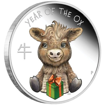 Wer zu Weihnachten eine Lunar-Silbermünze verschenken möchte, bekommt von der Perth Mint ein Sammlerstück, das bestens zum Anlass passt: die Silbermünze Baby Ox. Neben einem putzigen Kälbchen zeigt sie nämlich auch noch ein buntes Päckchen. Das kolorierte Sammlerstück aus 1/2 Unze Feinsilber eignet sich aber auch perfekt als Geschenk für Kinder die nächstes Jahr unter diesem Tierkreiszeichen geboren werden. Die Auflage ist auf 7.500 Stück limitiert.