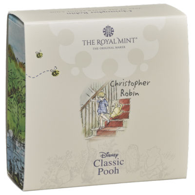 winnie-the-pooh-christopher-robin-8-g-silber-koloriert-verpackungDer echte Christopher Robin wurde 1920 geboren, sechs Jahre, bevor das erste Buch über Winnie the Pooh und seine Freunde erschien. Das Motiv der Silbermünze zeigt ihn als kleinen Jungen, der sein Lieblingsstofftier überall hin mitnimmt. Auf dem Münzmotiv zieht er Pu hinter sich die Treppe hinunter. Der sieht wie ein ganz normaler Teddybär aus, wird aber von einer einsamen Biene verfolgt – als könnte sie den Honig riechen, dem Pu in den Geschichten einfach nicht widerstehen kann. Unten ist auch der Name Christopher Robin verzeichnet.