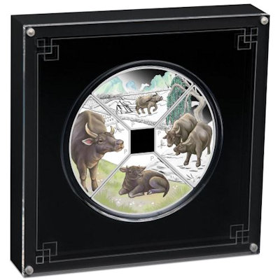Ein liebevoll gestalteter Glücksbringer für das Jahr des Ochsen 2021 ist das Quadrant Silber-Set der Perth Mint: Es besteht aus vier Silbermünzen in Fächerform, die sich zu einem Kreis mit einer quadratischen Auslassung in der Mitte zusammenfügen lassen und so an die Form traditioneller chinesischer Münzen erinnern. Jedes der Viertel enthält jeweils 1 Unze Feinsilber und ist mit aufwendigen Farbapplikationen versehen. Nur 1.500 Stück sind von diesem besonderen Set zu haben.