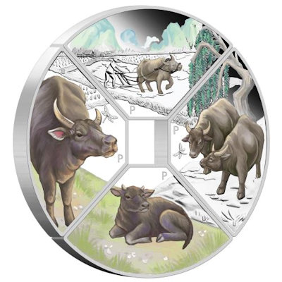 Die Motive der vier Silbermünzen zeigen Szenen aus dem Leben eines Ochsen. Oben ist das Tier vor einen Pflug gespannt, den es mit sichtlicher Anstrengung über den Acker zieht. Rechts ragt ein Baum ins Bild, der die Verbindung zum nächsten Quadranten bildet. Dort stehen zwei ausgewachsene Rinder in seinem Schatten beieinander. Auf dem unteren Viertel ist ein Kalb zu sehen, das es sich im Gras gemütlich gemacht hat. Der grasbewachsene Hügel zieht sich hinauf zum letzten Viertel. Dort steht ein ausgewachsener Ochse, über dessen Nase eine silberne Libelle tanzt.