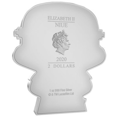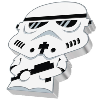 Diese Farbkombination gibt auch die Chibi-Silbermünze wieder. Typisch für den Stil ist der übergroße Kopf, der auf einem kleinen Körper mit Blastergewehr in den Händen ruht. Der Mini-Sturmtruppler enthält 1 oz Feinsilber bei einem Feingehalt von 999/1000 und ist 31,5 mal 36,0 Millimeter groß. Er hat einen glatten Rand. Die Wertseite zeigt das Porträt der Königin Elizabeth II. von Ian Rank-Broadley über dem Nennwert von zwei Dollars. Das Ausgabeland Niue ist darüber verzeichnet. Die Silbermünze steckt in einer Umverpackung mit Sichtfenster, auf die das nummerierte Echtheitszertifikat aufgedruckt ist.