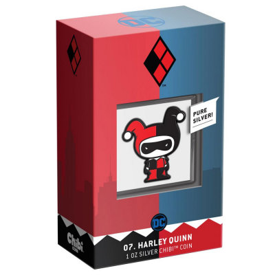 chibi-harley-quinn-1-oz-silber-koloriert-verpackungVon der Spitzenpsychiaterin zum Fall für die Psychiatrie: Harley Quinn alias Dr. Harleen Frances Quinzel verfiel als junge Ärztin dem Charme des Jokers und ist seither mehr als nur ein bisschen verrückt – aber auch unabhängig und frei zu tun, was sie gerade möchte. Ihren ersten Auftritt hatte sie in der Batman-Zeichentrickserie aus den 90ern. Erst danach tauchte die Figur, die sowohl vom Namen als auch vom Aussehen her an den Harlekin angelehnt ist, in Comics auf. Inzwischen kennen die meisten sie in ihrem Suicide-Squad-Look. In dem gleichnamigen Realfilm wurde sie von Margot Robbie dargestellt. Die Silbermünze zeigt dagegen die „klassische“ Harley.