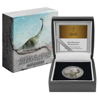 Tyrannosaurus rex, Triceratops, Pterodaktylus und Stegosaurus – die New Zealand Mint bannt in ihrer Dinosaurier-Serie die berühmtesten Dinostars auf Silbermünzen. Aber mindestens einer fehlt noch, ein echtes Schwergewicht unter den Urzeitwesen und ein absoluter Liebling der Fans: der Brontosaurus. Mit der neuesten Ausgabe der Serie ist er nun endlich zu haben. Die Auflage des Sammlerstücks mit Antik-Finish ist streng limitiert auf nur 2.000 Stück.