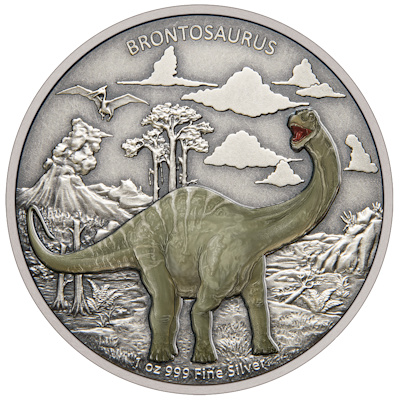 Der Brontosaurus ist in Grüntönen koloriert und füllt fast die ganze Breite der Münze aus. Der silberne Hintergrund zeigt eine urzeitliche Landschaft mit einem Vulkan und einem Flugsaurier am Himmel. Über dieser Szene ist der Name des Dinosauriers aufgeprägt. Der Münzrand ist geriffelt. Umseitig findet man das Porträt von Königin Elizabeth II., darüber das Ausgabeland Niue. Der Nennwert ist mit 2 Dollars angegeben. Die Silbermünze hat einen Durchmesser von 40 Millimetern und enthält 1 oz Feinsilber bei einem Feingehalt von 999/1000. Sie ist verpackt in ein Etui und in einem Shipper, auf dem ein Brontosaurus abgebildet ist. Ein nummeriertes Echtheitszertifikat gibt es dazu.