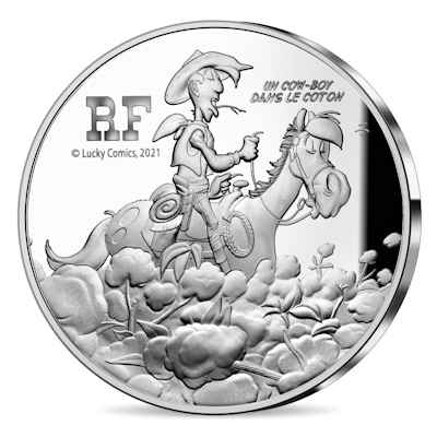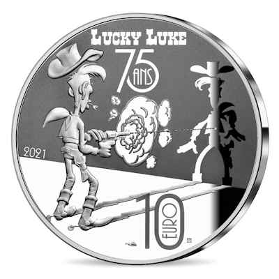 Die Wertseite der Silbermünze, die den Nennwert von 10 Euro trägt, zeigt die berühmte Szene von Lucky Lukes „Duell “ mit seinem Schatten. Umseitig ist der Cowboy auf seinem treuen Pferd Jolly Jumper zu sehen, wie er durch ein Baumwollfeld reitet. Das in der höchsten Qualität Polierte Platte geprägte Sammlerstück hat einen Durchmesser von 37 Millimetern und einen Feingehalt von 900/1000. Das Gewicht liegt bei 22,20 Gramm. Der Münzrand ist glatt. Ausgeliefert werden die Silbermünzen gekapselt, im Etui und mit Umverpackung. Ein nummeriertes Echtheitszertifikat gibt es auch dazu.