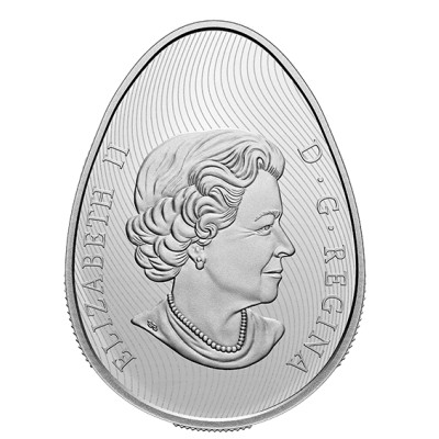 Die traditionellen Muster werden auf dieser Silbermünze durch ein zusätzliches Element ergänzt: Auf einem silbernen Band in der Mitte sind das Land Canada und der Nennwert von 20 CAD verzeichnet. Umseitig ziert das Susanna-Blunt-Porträt von Königin Elizabeth II. das Silber-Ei, das 45 Millimeter lang und 33 Millimeter breit ist. Das Sammlerstück enthält 1 oz Feinsilber bei einem Feingehalt von 99,99 Prozent. Der Münzrand ist geriffelt mit Unterbrechungen. Die Silbermünze ist in höchster Proof-Qualität geprägt. Sie wird im Etui und zusammen mit einem nummerierten Echtheitszertifikat ausgegeben.