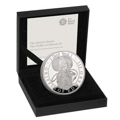 Der Greif auf dem Motiv der Silbermünze hält einen Wappenschild in den Klauen, der den Turm von Windsor Castle zeigt, wo Edward III. geboren wurde. Er hat die Flügel halb ausgebreitet und sein Löwenschwanz beschreibt einen Bogen hinter der Figur. Das Sammlerstück aus 1 oz Feinsilber mit einem Feingehalt von 999/1000 ist in der höchsten Prägequalität Polierte Platte gefertigt. Auf der Wertseite findet man das Porträt von Königin Elizabeth II. von Jody Clark unter dem Nennwert von 2 Pfund. Die randläufig aufgeprägte Abkürzung D.G. Reg. F. D. steht für „Dei gratia regina fidei defensor“ (Königin von Gottes Gnaden, Verteidigerin des Glaubens). Die Silbermünze wird gekapselt, im Etui und mit einem Echtheitszertifikat ausgegeben. Die Auflage ist auf nur 4.400 Stück limitiert.