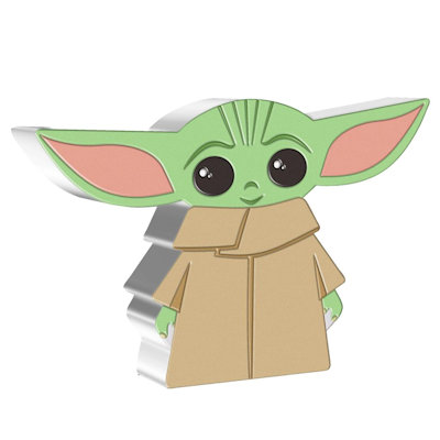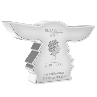 Die Silbermünze in der markanten Form von „Baby Yoda“ enthält 1 oz Feinsilber und hat einen Feingehalt von 999/1000. Der Münzrand ist glatt. Auf der Wertseite findet man das Porträt der Königin Elizabeth II. von Ian Rank-Broadley und darunter den Nennwert von 2 Dollars. Ausgabeland ist Niue. Ausgegeben wird das Sammlerstück in einem Etui mit Sichtfenster, sodass sich die Münze gut präsentieren lässt. Ein nummeriertes Echtheitszertifikat gehört dazu.