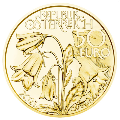 naturschatz-alpen-wald-gold-oesterreich-3Die Wertseite der in höchster Prägequalität Polierte Platte geprägten Goldmünze zeigt die anmutigen Blütenkelche der Dunklen Glockenblume, deren wissenschaftlicher Name, Campanula pulla, unten am Rand verzeichnet ist. Die dunkelviolett blühende Pflanze kommt nur in Österreich – und hier vor allem in den Kalkalpen – vor. Rechts der Blumen ist der Nennwert von 50 Euro verzeichnet. Das Sammlerstück enthält  1/4 oz Feingold bei einem Feingehalt von 986/1000. Es hat einen Durchmesser von 22 Millimetern und einen glatten Rand. Ausgegeben wird die Goldmünze gekapselt und im Etui. Ein Echtheitszertifikat gibt es dazu.