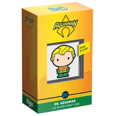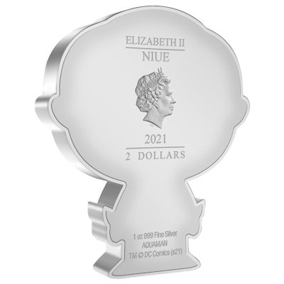 Der Chibi-Aquaman präsentiert sich den Fans dementsprechend auch stolz mit blonder Schmalzlocke und grellem Kostüm. Er ist 31,5 mal 36,0 Millimeter groß und enthält 1 oz Feinsilber (Feingehalt: 999/1000), die in die Form der Superhelden-Fugur gebracht wurde. Der Rand ist glatt. Die Wertseite der Silbermünze zeigt den Nennwert von 2 Dollars unter dem Porträt der Königin Elizabeth II. von Ian Rank-Broadley und dem Ausgabeland Niue. Das Sammlerstück wird mit nummeriertem Echtheitszertifikat und in einer Umverpackung mit Sichtfenster ausgegeben.