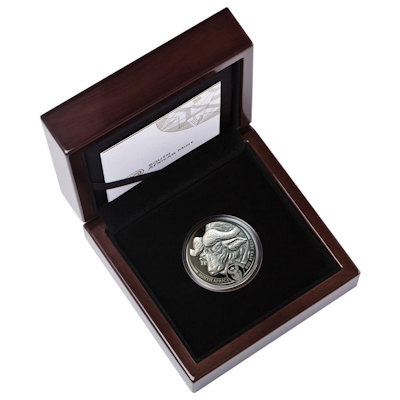 Der Büffel auf dem Münzmotiv macht denn auch einen wachsamen Eindruck. Seine Hörner ragen aus dem Bild heraus, mit dem Auge scheint er den Betrachter zu fixieren. Unten ist das Wappen von Südafrika abgebildet. Noch mehr Büffel gibt es auf der Wertseite: Hier sieht man zwei halbe Büffelköpfe. Wenn man mehrere Münzen nebeneinander legt, bekommt man das ganze Bild und schafft so nach und nach eine ganze Büffelherde. In der Mitte ist – eingerahmt von den Büffelhörnern – der Nennwert von 20 Rand verzeichnet. Die Platinmünze enthält 1 oz Platin und hat einen Feingehalt von 999,5/1000. Der Durchmesser liegt bei 32,69 Millimetern. Der Münzrand ist geriffelt. Das Sammlerstück ist in höchster Proof-Qualität geprägt und wird gekapselt sowie in ein stilwolles Etui verpackt ausgegeben. Ein nummeriertes Echtheitszertifikat gibt es dazu.