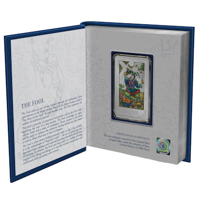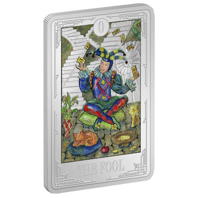 Der Narr hat die Zahl 0, die auch auf der Silbermünze oben verzeichnet ist. Er gehört zu den Großen Arkana im Tarot. Diese Karten sind mit den Trümpfen in Kartenspielen vergleichbar. Auch die Tarotkarten gingen aus Spielkarten hervor und wurden erst im Lauf der Zeit bei Wahrsagern und Esoterikern beliebt. Der Narr steht bei ihnen für Unbekümmertheit und Leichtsinn, aber auch Abenteuer und Neugier. Er kann also sowohl positiv als auch negativ interpretiert werden. Eine der bekanntesten Darstellungen zeigt den Narren als unbeschwerten jungen Mann, der ohne es zu merken über eine Klippe tritt. Bei der New Zealand Mint hat man sich jedoch für ein weniger beunruhigendes Bild entschieden.