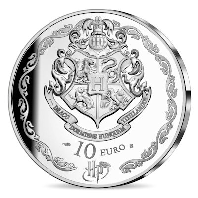Die Silbermünze mit einem Gewicht von 22,2 Gramm und einem Feingehalt von 999/1000 hat einen Durchmesser von 37,0 Millimetern. Sie ist in der höchsten Qualität Polierte Platte hergestellt. Der Münzrand ist glatt. Der Nennwert von 10 Euro ist über dem Harry-Potter-Logo und unter dem Hogwarts-Wappen zu finden. Dieses zeigt vier Tiere als Symbole für die vier Schulgründer: Der Löwe steht für Harrys Haus Gryffindor, die Schlange für Slytherin, der Adler für Ravenclaw und der Dachs für Hufflepuff, das inzwischen als Haus von Newt Scamander aus der Reihe „Fantastische Tierwesen“ seine Reputation aufbessern konnte. Verpackt ist das Sammlerstück in ein buchartiges Etui, das eine Filmszene mit Harry zeigt. Ein Echtheitszertifikat gibt es dazu. Eine Goldmünze mit Harry und Dumbledore ist ebenfalls erhältlich.