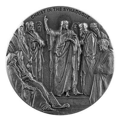 Ein Prophet gilt nichts in seinem eigenen Land – diese bekannte Redewendung stammt aus dem Kontext der Szene, die die 36. Ausgabe der Biblical Series der Scottsdale Mint eindrucksvoll präsentiert. Das Sammlerstück aus zwei Unzen Feinsilber zeigt eine Darstellung von Jesus in der Synagoge, die an einen Holzschnitt des Künstlers Gustave Doré angelehnt ist. Es hat eine streng limitierte Auflage von nur 1499 Exemplaren.