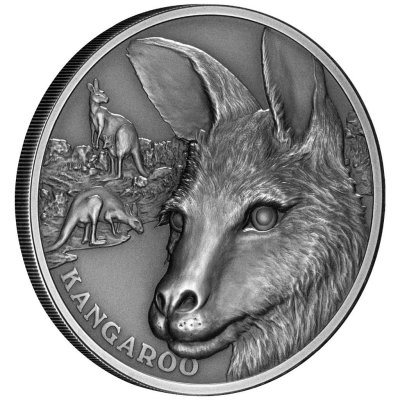 Über 60 Känguru-Arten gibt es – von Riesenkängurus über Baumkängurus bis zum Quokka. Die Vorstellung von dem Beuteltier ist aber vor allem von den Roten Riesenkängurus geprägt. Auch bei den Exemplaren auf dem Motiv der Silbermünze könnte diese größte lebende Art Pate gestanden zu haben. Darauf deutet der Körperbau der zwei Exemplare im Hintergrund hin. Aber auch der Kängurukopf im Vordergrund, der das Motiv der Silbermünze dominiert, ähnelt mit den langen Ohren, der langgestreckten Schnauze und dem kurzen Fell einem Riesenkänguru. Diese Details kommen dank der Hochrelief-Prägung besonders gut zur Geltung.