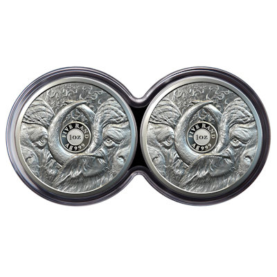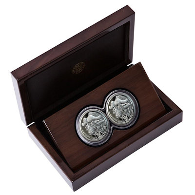 Auch die Büffel auf der Wertseite der Silbermünze wirken angriffslustig. In dem Silbermünzen-Set zeigen zwei in höchster Proof-Qualität geprägte Exemplare nebeneinander in einer Doppelkapsel einen kompletten Büffelkopf und zwei Hälften. Die Nennwertangabe von 5 Rand ist jeweils in der Mitte der Silbermünzen zu finden. Umseitig wirkt das Büffelbild etwas friedlicher, aber nicht weniger beeindruckend. Jede Münze für sich hat einen Durchmesser von 38,73 Millimetern und enthält 1 oz Feinsilber. Der Feingehalt liegt bei 999/1000. Der Münzrand ist geriffelt. Die Doppelkapsel ist eingebettet in ein stilvolles Holzetui und wird mit einem nummerierten Echtheitszertifikat ausgegeben.