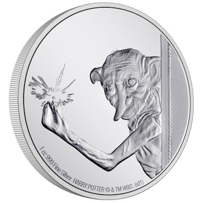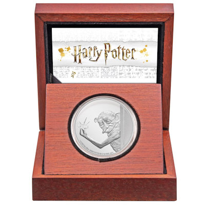 Auf der in Proof-Qualität geprägten Silbermünze trägt Dobby noch den schmutzigen Kissenbezug, in dem er als Diener der Malfoys sein Dasein fristet. Die großen Ohren und Augen sowie die lange Nase machen ihn unverkennbar. Das Fingerschnippen ist das Signal dafür, dass er gerade zaubert. Als Vorbild für das Motiv diente die Szene, in der Dobby bei den Dursleys für ein katastrophales Abendessen sorgt, was beinahe dazu führt, dass Harry von der Schule fliegt. Geprägt aus 1 oz Feinsilber mit einem Feingehalt von 999/1000 hat die Silbermünze einen Durchmesser von 40 Millimetern. Der Münzrand ist geriffelt. Auf der Wertseite findet man das Porträt von Königin Elizabeth II. neben dem Nennwert von 2 Dollars. Als Ausgabeland fungiert Niue. Das Sammlerstück ist in ein stilvolles Holzetui verpackt und wird inklusive eines nummerierten Echtheitszertifikats geliefert. Auf der Umverpackung ist Harry Potter zu sehen.