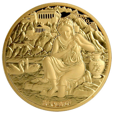 Eine der wohl bekanntesten Darstellungen der Göttin der Liebe ist das Gemälde „Die Geburt der Venus“ von Sandro Botticelli. Es zeigt, wie sie in einer Muschel dem Meer entsteigt. Die Verbindung zum Wasser ist auch auf dem Motiv der Kupfermünze zu finden. Hier sitzt Aphrodite jedoch am Ufer. Ein Schwanenpaar leistet ihr Gesellschaft. Im Hintergrund ist eine feslsige Küste mit zwei griechischen Tempeln zu sehen. Oben findet man den Namen der Göttin, unten den Nennwert von 20 Cents.