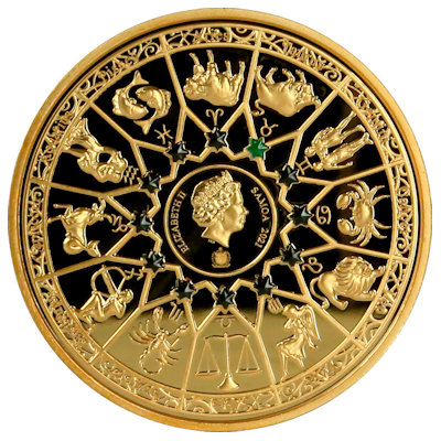Umseitig zeigt die Kupfermünze, die einen Durchmesser von 40 Millimetern hat, alle zwölf Sternzeichen. Sie sind kreisförmig in einem regelmäßigen Muster angeordnet. An den Kreuzungspunkten dieses Musters sitzt jeweils ein dunkler Stern. Nur über dem Stier ist dieser grün gefärbt. Den Mittelpunkt des Kreises bildet das Porträt von Königin Elizabeth II., da Samoa zum Commonwealth gehört. Die östlichen Inseln sind dagegen als Amerikanisch-Samoa ein Überseegebiet der USA. Die Kupfermünze hat einen Feingehalt von 999/1000 und wiegt 25 Gramm. Sie ist in BU-Qualität hergestellt. Der Münzrand ist geriffelt. Ausgegeben wird das Sammlerstück gekapselt, im Etui und mit Echtheitszertifikat. Die erste Ausgabe der Serie zeigt Athena und den Widder.