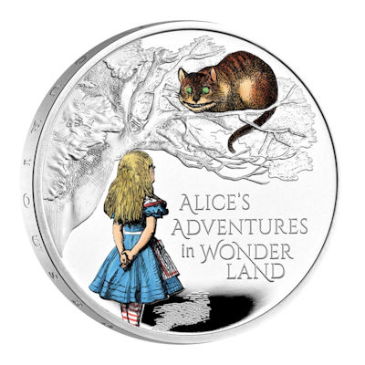 Vorbild für die Gestaltung des Münzmotivs waren die Original-Illustrationen von John Tenniel. Generationen von Kindern sind mit ihnen aufgewachsen. Seit der Erstausgabe 1865 waren Alices Abenteuer so beliebt, dass das Buch ständig nachgedruckt wurde. 1951 nahm sich auch Walt Disney der Geschichte an und machte einen Trickfilm daraus. Auf der Silbermünze sieht man Alice im Gespräch mit der Grinsekatze, die auf einem Ast sitzt. Neben dem Mädchen ist der Originaltitel Alice’s Adventures in Wonderland aufgeprägt.