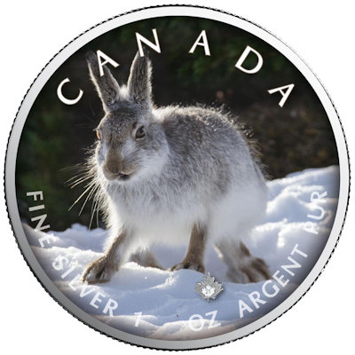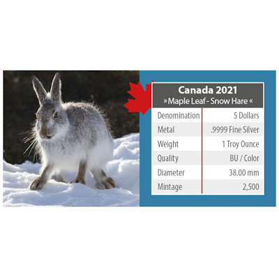 maple-leaf-on-the-trails-of-wildlife-snow-hare-1-oz-silber-koloriertViele kanadische Tiere sind ideal an ihren kalten Lebensraum im hohen Norden angepasst, vom Eisbären bis zum kleinen Schneehasen. Die Sonder-Serie „Wildtieren auf der Spur“ der Anlagemünze Maple Leaf zeigt die faszinierenden Vierbeiner in ihrem natürlich Lebensraum. Die neueste Ausgabe ist die Silbermünze mit dem Schneehasen (snow hare). Wie die Vorgänger hat sie eine streng limitierte Auflage von nur 2.500 Exemplaren.