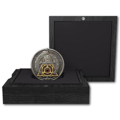 Schon der Rand dieser beeindruckenden Silbermünze hat Symbolcharakter: Er ist als Schlange, die sich selbst in den Schwanz beißt, gestaltet. Dieses Bild steht für die Ewigkeit und in der Alchemie für den Kreislauf der Materie. Im Mittelpunkt des Motivs steht Nicolas Flamel, der als Erfinder des Steins der Weisen gilt, einer mystischen Substanz, von der man glaubte, dass sie das Leben verlängern und Blei in Gold verwandeln könne. Der Stein der Weisen wird hier durch einen roten Swarovski-Kristall repräsentiert. Er ist umgeben von einem Kreis und einem Quadrat und zusammen mit Flamel in das Dreieck – das alchemistische Symbol für Feuer – eingebettet. Es gibt aber noch viele weitere Symbole zu entdecken, etwa Sonne und Mond, Stier und Löwen oder zwei Drachen. Alles ist mit großer Detailgenauigkeit geprägt und mit einem eindrucksvollen Antik-Finish überzogen.