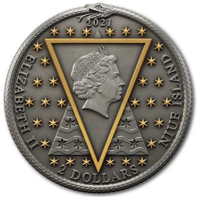 Umseitig ist das Porträt von Königin Elizabeth II. zu finden, da Niue als Ausgabeland für dieses Sammlerstück fungiert. Es ist ebenfalls in ein Dreick eingebettet, wobei die Spitze jedoch nach unten zeigt – wie bei dem Symbol für Wasser. Kolorierte Sterne bedecken die Münzfläche. Unten ist der Nennwert von 2 Dollars verzeichnet. Die Silbermünze hat einen Durchmesser von 50 Millimetern und enthält 2 oz Feinsilber bei einem Feingehalt von 999/1000. Sie wird in einem Etui mit Umverpackung und mit Echtheitszertifikat ausgegeben.
