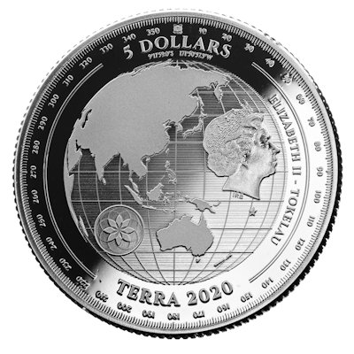 terra-2020-1-oz-silberDen Großteil von Asien sowie Australien mit Neuseeland findet man umseitig. Auch ein Porträt von Königin Elizabeth II. ziert die Wertseite der Anlagemünze. Da Tokelau ein neuseeländisches Verwaltungsgebiet ist, gilt die Queen auch dort als offizielles Staatsoberhaupt. Die Lage der Inseln ist etwas unterhalb des Monarchinnenkopfes markiert. Der Nennwert von 5 Dollars ist oben zu finden. Die Silbermünze hat einen geriffelten Rand und einen Durchmesser von 38 Millimetern. In der Qualität proof-like wird sie einzeln gekapselt ausgegeben.