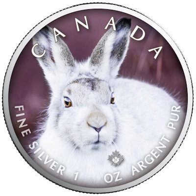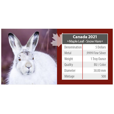 Der Schneehase auf dem kolorierten Münzmotiv, der auch auf der dazugehörigen Coincard zu sehen ist, wendet dem Betrachter das Gesicht zu. Sein kuscheliges, dichtes Fell ist fein gezeichnet, die kurzen Ohren mit den schwarzen Spitzen geben ihm ein verwegenes Aussehen. Unter seiner Nase ist das Maple Leaf in Privy-Mark-Größe aufgeprägt. Aus 1 oz Feinsilber geprägt und bei einem Feingehalt von 99,99 Prozent hat die Silbermünze einen Durchmesser von 38 Millimetern. Der Münzrand ist geriffelt. Auf der Wertseite darf das Susanna-Blunt-Porträt von Königin Elizabeth II. nicht fehlen. Darunter ist der Nennwert von 5 CAD verzeichnet. Die in Stempelglanz-Qualität geprägte Silbermünze wird einzeln gekapselt ausgegeben.