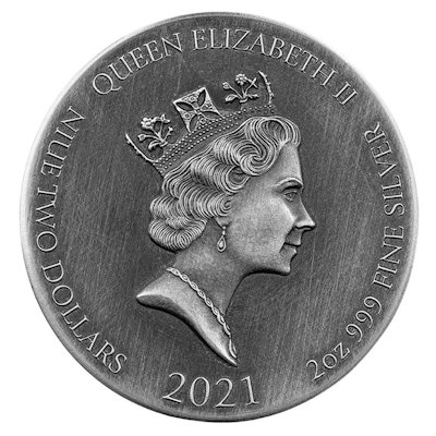 Die Szene auf dem Motiv der Silbermünze zeigt, wie der Held mit beiden Händen die mächtigen Steinsäulen zum Einsturz bricht, sodass das Dach Scharen von Philistern unter sich begräbt. Ein Antik-Finish verleiht allem eine angemessen historische Patina. Rechts ist randläufig zu lesen, welche Szene hier dargestellt ist. Die Silbermünze enthält 2 oz Feinsilber (Feingehalt: 999/1000) und hat einen Durchmesser von 39 Millimetern. Die Wertseite zeigt das – nicht ganz aktuelle – Porträt der Königin Elizabeth II. von Raphael Maklouf und den Nennwert von 2 Dollars. Als Ausgabeland fungiert Niue. In den glatten Münzrand ist die Seriennummer eingraviert. Verpackt ist das Sammlerstück in ein Etui, das passend zum Thema wie eine ledergebundene Bibel gestaltet ist.